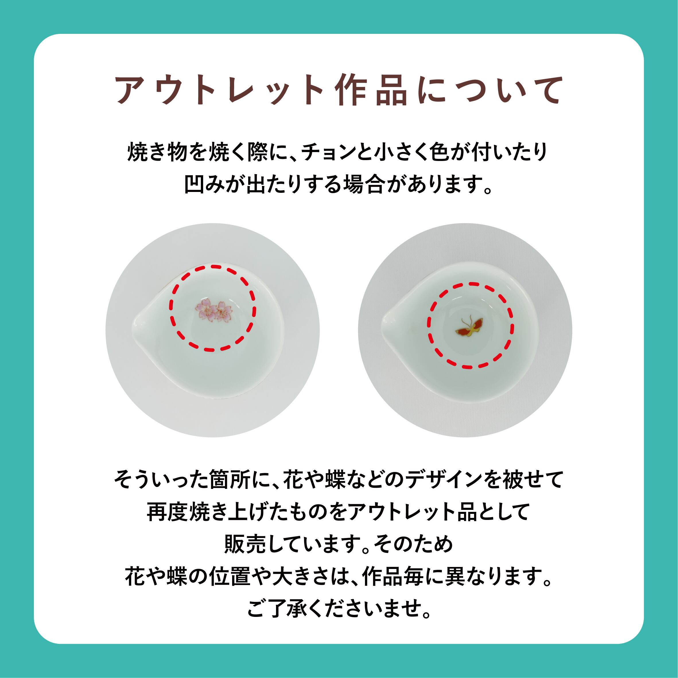 そういった箇所に、花や蝶などのデザインを被せて再度焼き上げたものをアウトレット品として販売しています。