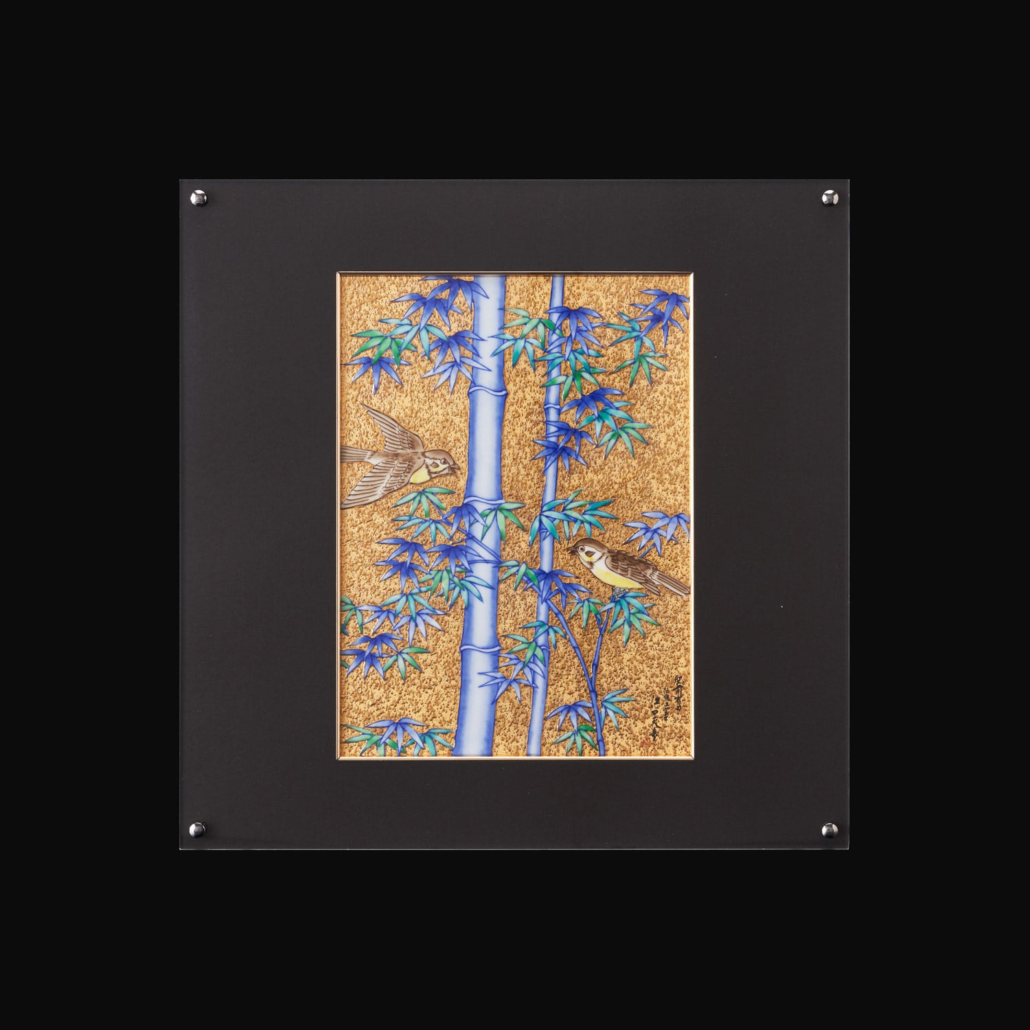 金彩を背景にまっすぐ伸びる竹の凛とした姿を描き、落ち着いた趣きがあります。
